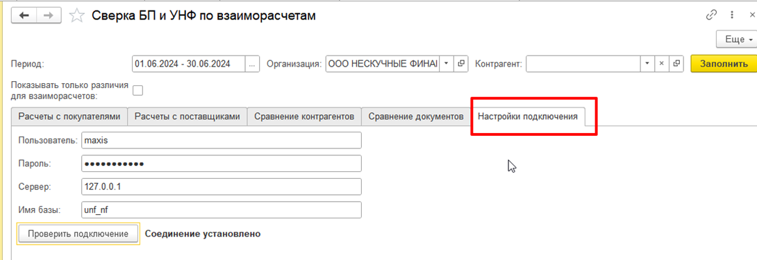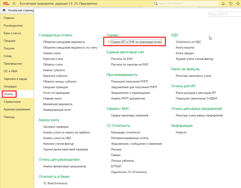 Запускается сверка из раздела Отчеты – Сверка БП и УНФ по взаиморасчетам