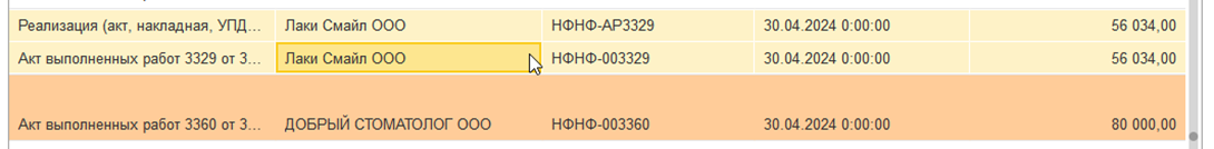 На данном примере мы видим, что по контрагенту Лаки Смайл совпадает Акт УНФ с бухгалтерией а по контрагенту Добрый Стоматолог акт не перегружен или не найден в Бухгалтерии