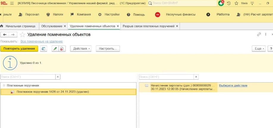 В УНФ не удается удалить платежное поручение? Долго и не удобно отвязывать их от Начисления зарплаты?