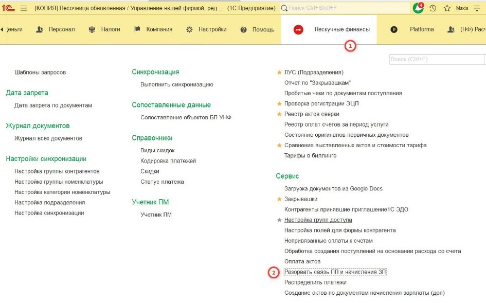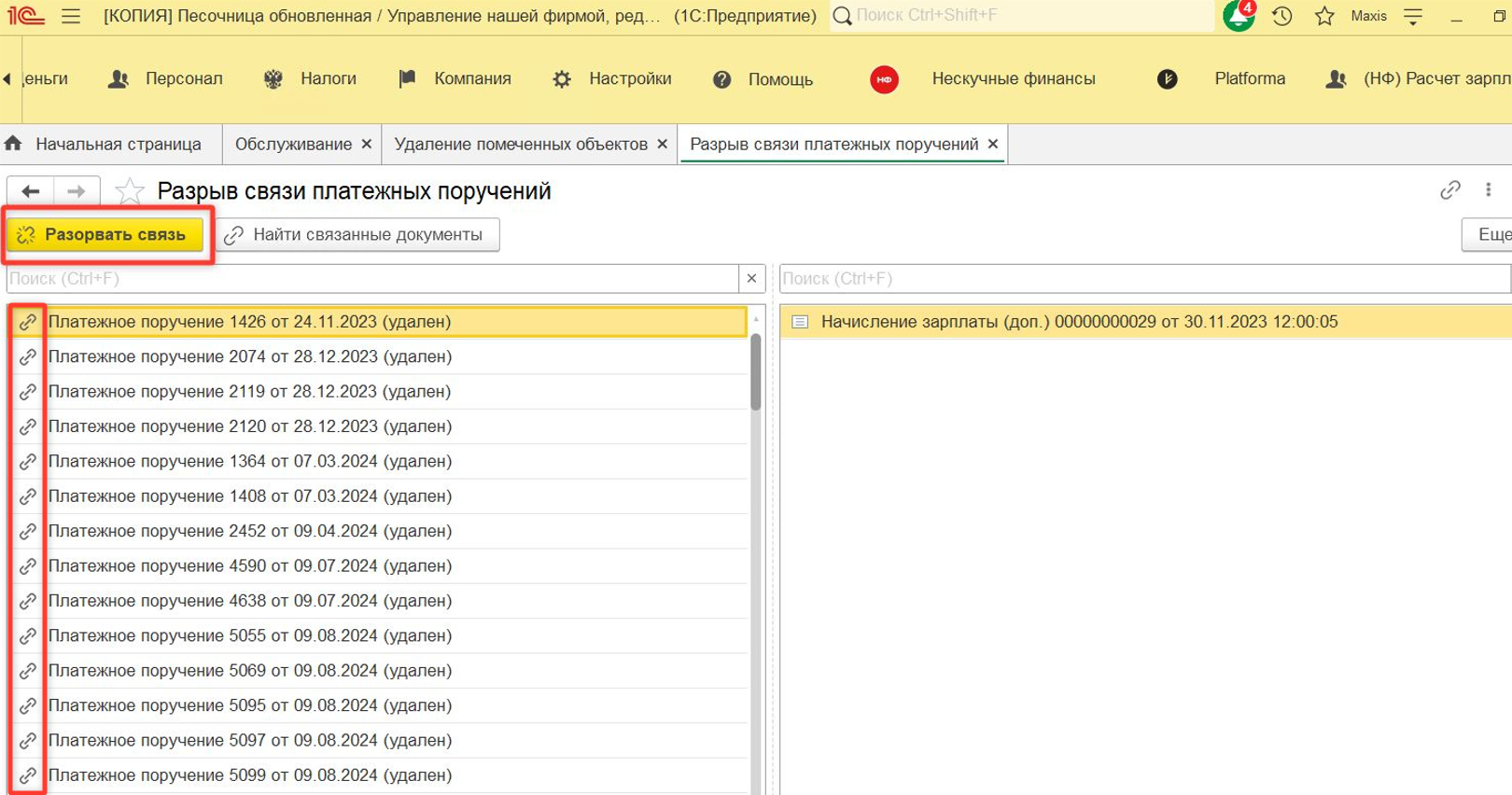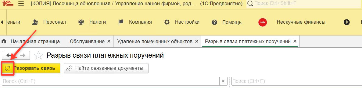 В решении данного вопроса поможет обработка «Разорвать связь ПП и начисления ЗП». Расположена она в разделе "Нескучные финансы":